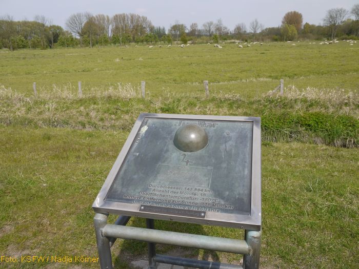 Im richtigen Maßstab von Größe und Entfernung sind hier alle Planeten unseres Sonnensystems zu finden. Am Wegesrand befinden sich kleine Tafeln mit Erklärungen und Planeten zum Anfassen (Bild 2). Auch die Erklärungen sind "zum Anfassen", in Braille- und in Klarschrift ausgeführt.