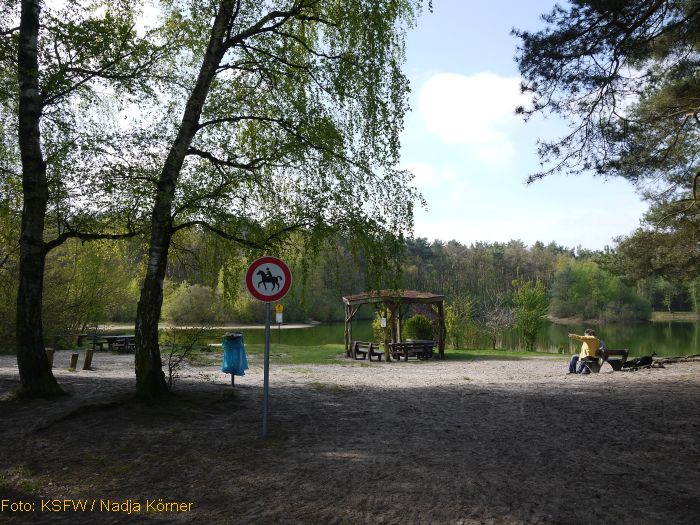 Der Weg ist gut befahrbar und bietet zudem Abwechslung. Schon bald kommt man über einen Waldweg zu den Holmer Sandbergen (Bild 1). Dort kann die Pause schön am See genossen werden (Bild 2). Anschließend geht es durch den Wald weiter bis auf den Lehmweg in Holm.